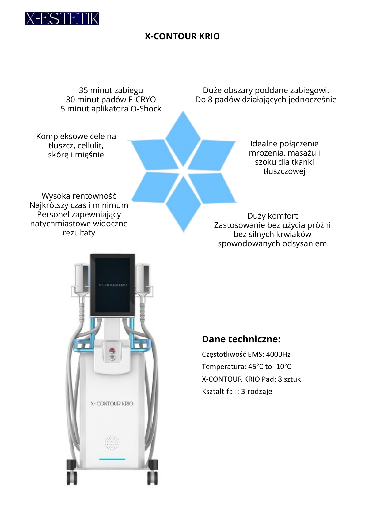 - Parametry: EMS 4000 Hz, temperatura 45°C do −10°C, 3 rodzaje kształtu fali.