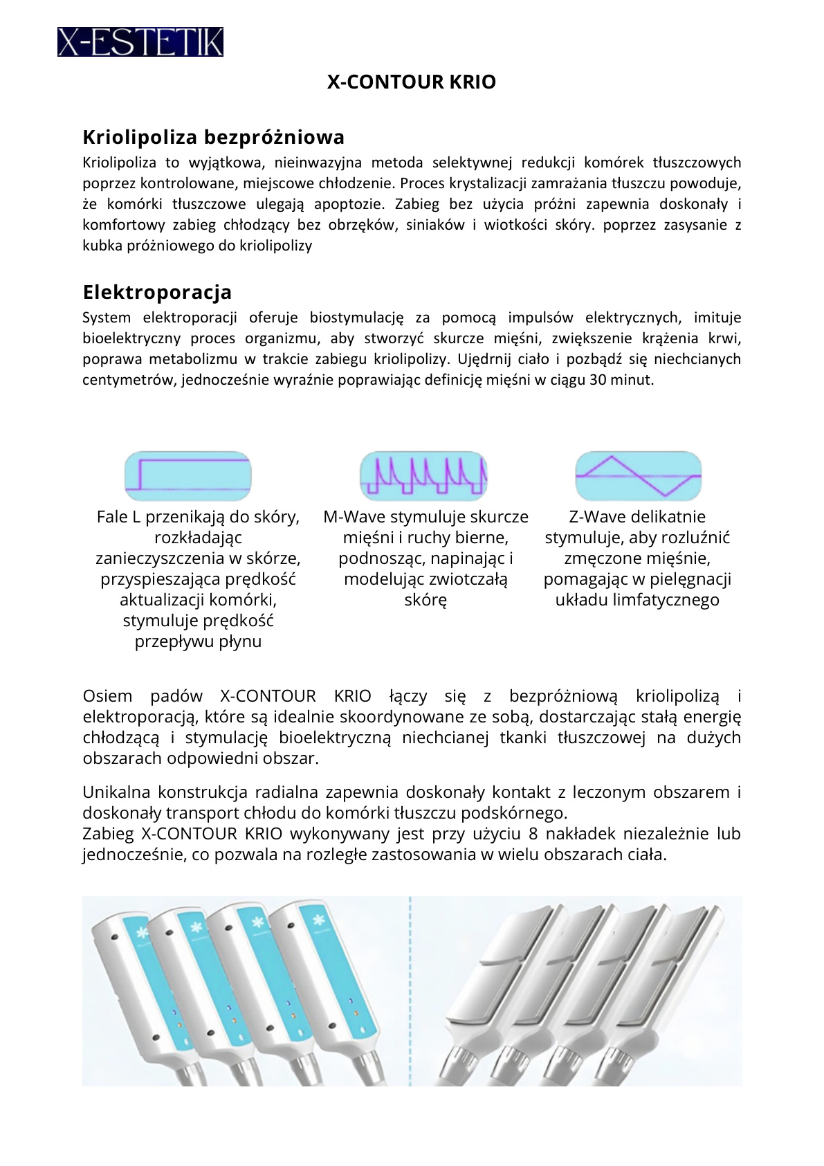 Bezpróżniowa kriolipoliza połączona z elektroporacją i EMS. 8 padów może pracować niezależnie lub jednocześnie, co pozwala wykonywać zabiegi na dużych obszarach ciała.